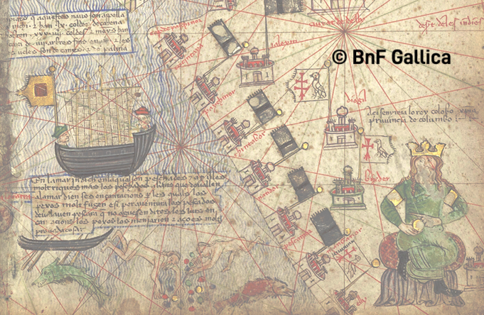 Bagian dari atlas Catalan yang menggambarkan sebuah kapal jung Jawa bertiang lima (jong Jawa) di Laut Arab, 1375 dengan inkripsi bagian atas sebagai berikut; “Sapiats que aquestes naus són appellades Nichi e han ·LX· coldes de carena e hobren ·XXX·IIII· coldes e menys han encara de ·IIII· arbres fins en ·X· e les [lurs] veles són de canes e palma” dengan terjemahan bebas; [Ketahuilah bahwa kapal-kapal ini disebut “inchi” dan memiliki lambung sepanjang enam puluh hasta dengan tiga puluh empat hasta freeboard. Di atasnya terdapat antara empat dan sepuluh tiang, dan layarnya terbuat dari rotan dan palem] Note : Inchi adalah kesalahan penyalinan dari jũchi, atau jung, dari bahasa Jawa jong